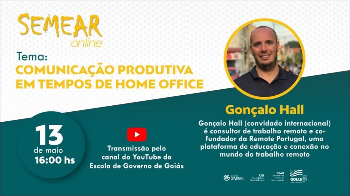 A próxima edição do projeto Semear On-line, projeto da Escola de Governo, ocorre no dia 13 de maio com o tema: “Comunicação produtiva em tempos de home office”. O encontro virtual contará com a palestra do consultor de trabalho remoto e co-fundador da Remote Portugal, Gonçalo Hall. De nacionalidade portuguesa, o especialista vai abordar a importância da comunicação assíncrona e as diversas formas de interlocução profissional.